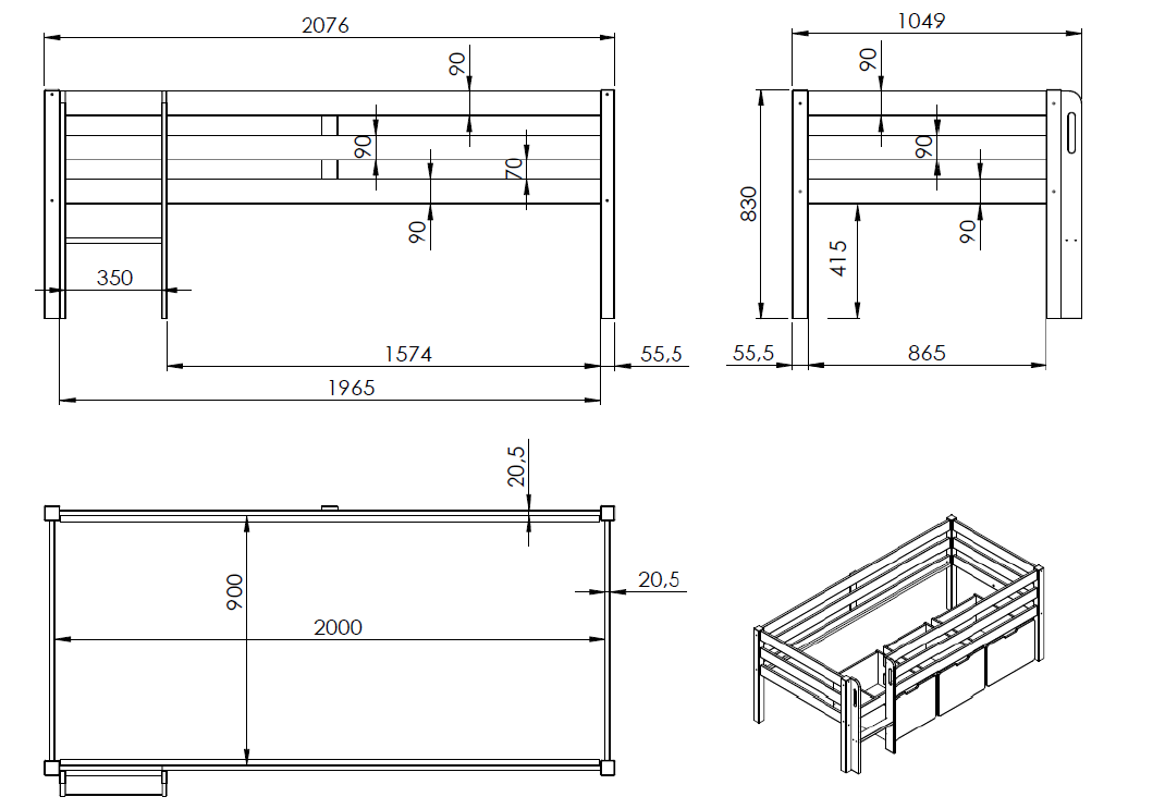LOFT BED PINO WHITE 90x200CM