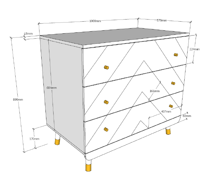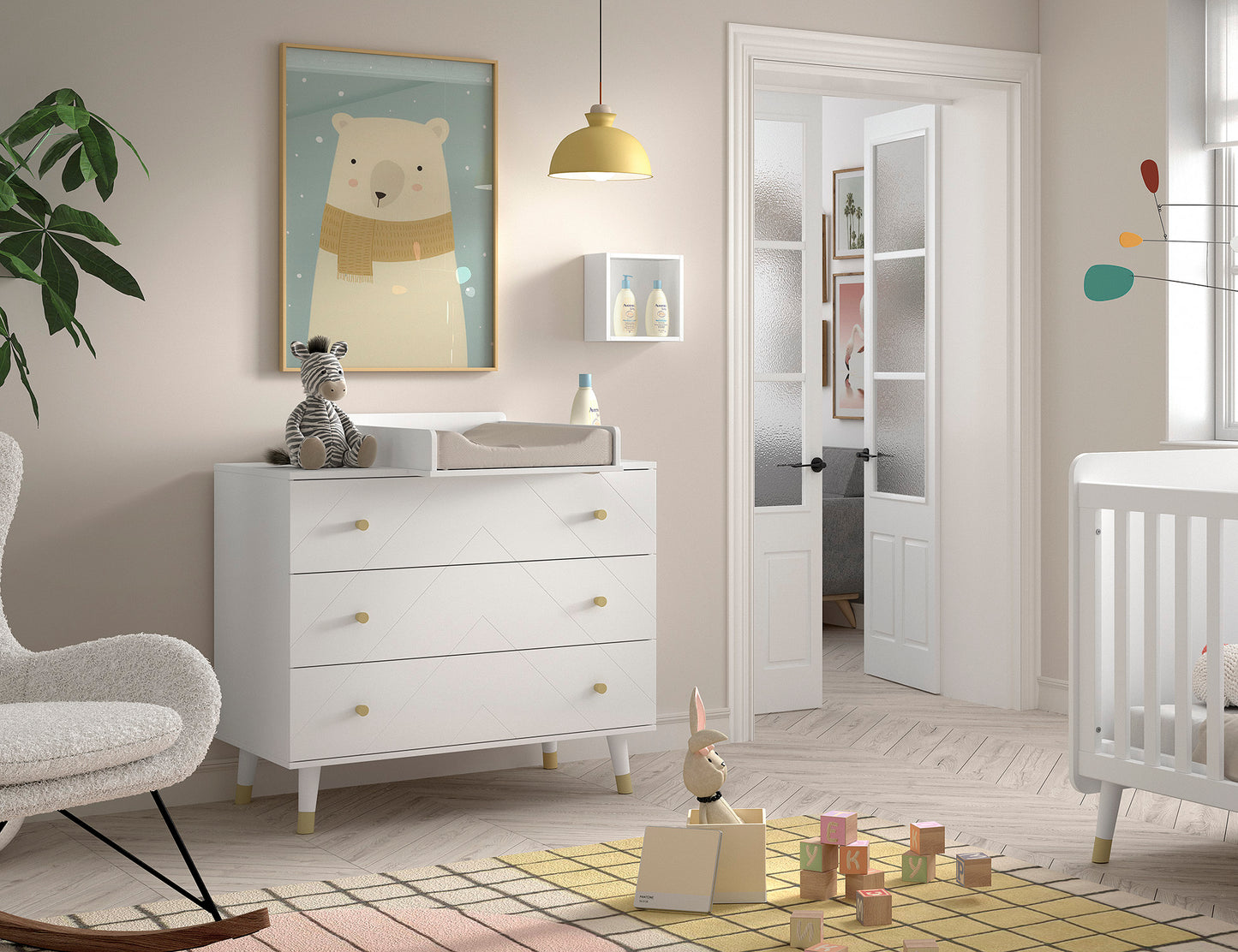 The dresser from the BILLY collection in satin white features three spacious drawers with graphic front panels and golden handles. Measuring 100 x 74 x 100cm, it offers ample storage for essentials. Add the optional changing topper for a practical and elegant baby-care station with raised edges and sturdy construction.