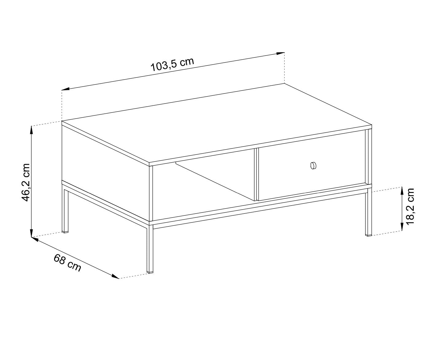 Valmistatud vastupidavatest materjalidest – puitplaat, melamiin, MDF ja teras –, ühendab see laud praktilisuse ja luksusliku disaini. Kaks sahtlit ja avatud riiul pakuvad piisavalt ruumi igapäevaste esemete hoiustamiseks ning dekoratsioonide esitlemiseks.