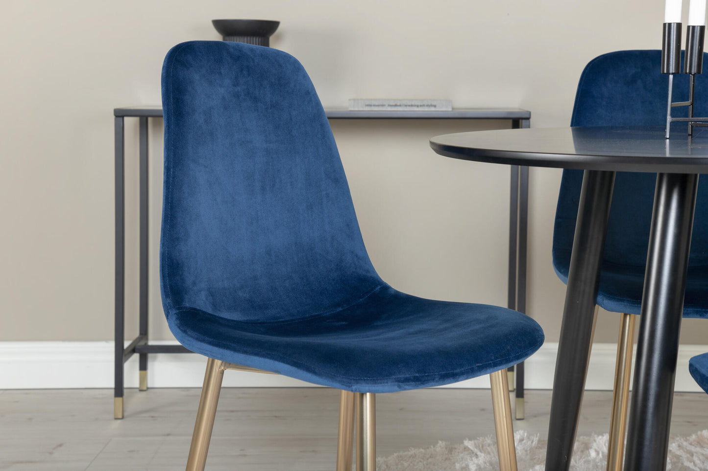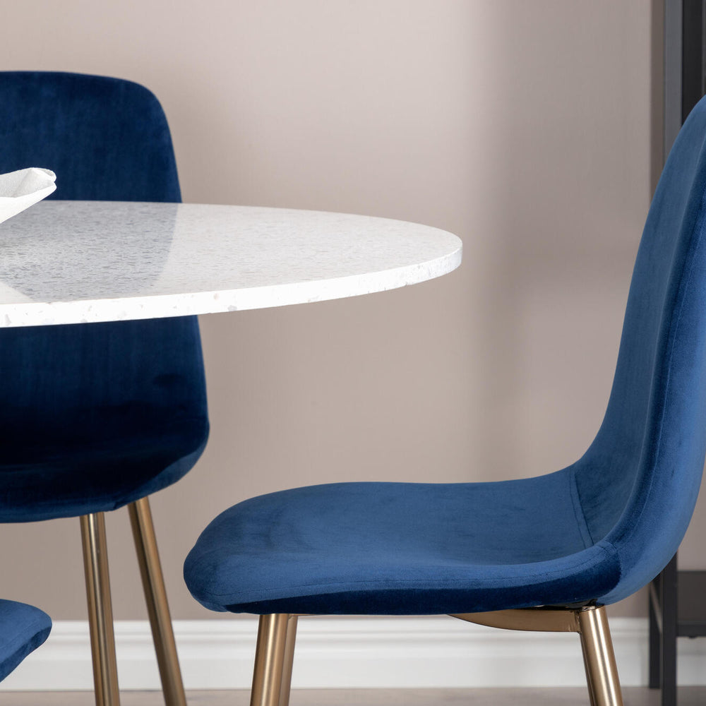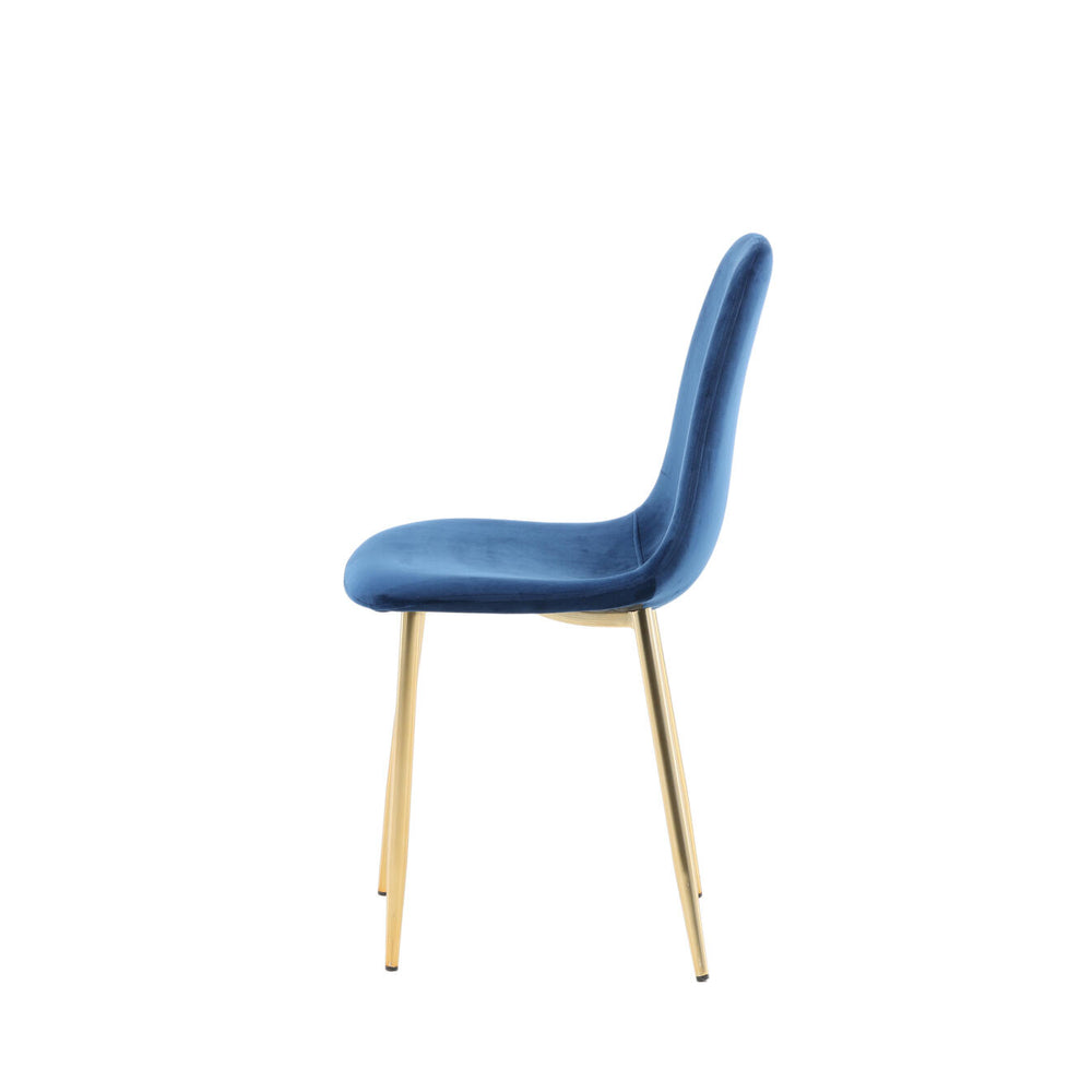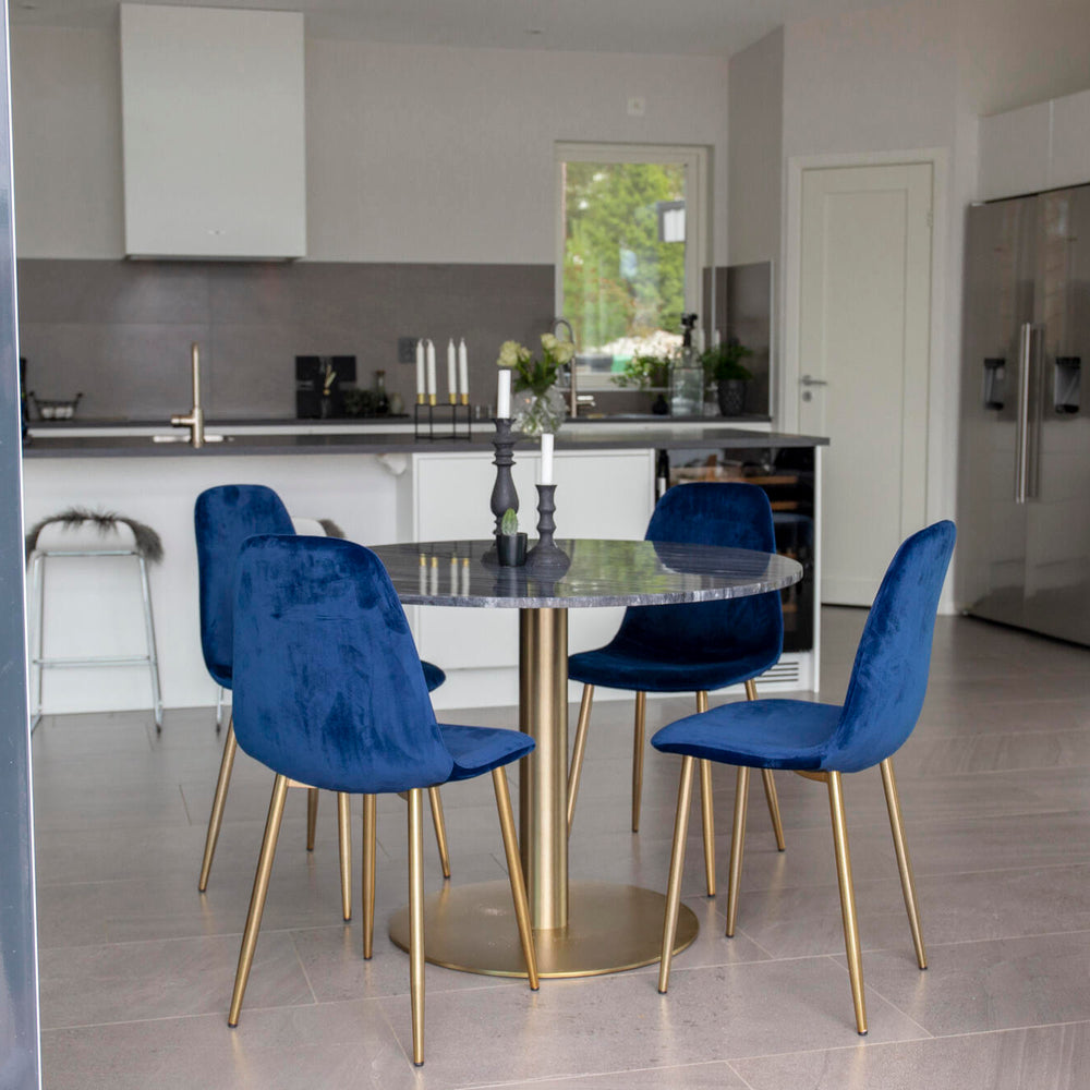 Sügavsinine sametkate, messingutoonis metalljalad ning polsterdatud iste ja seljatugi loovad luksusliku koosluse, mis tõmbab pilke ja lisab interjöörile eksklusiivse puudutuse.