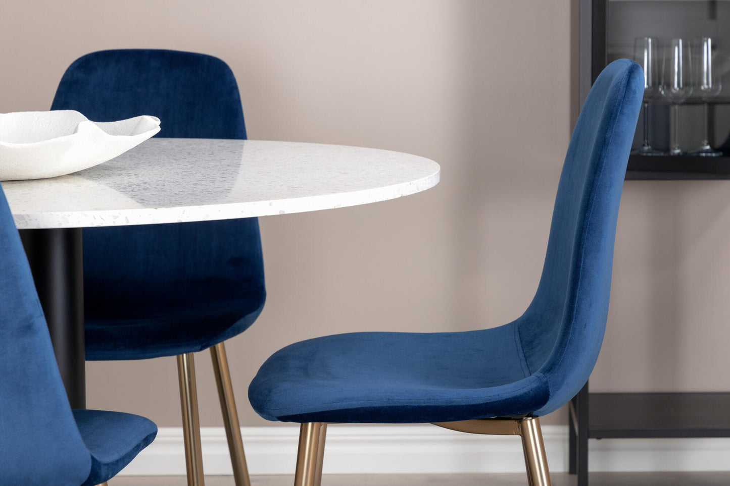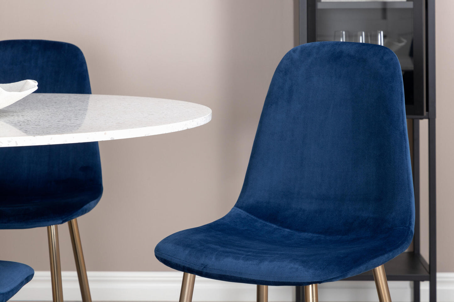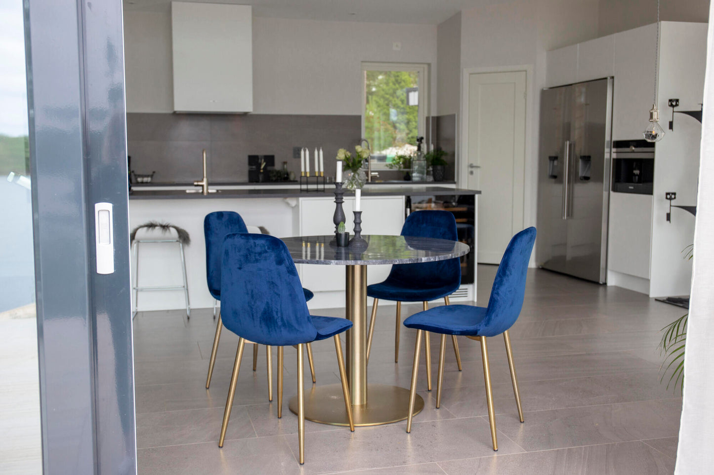 Sügavsinine sametkate, messingutoonis metalljalad ning polsterdatud iste ja seljatugi loovad luksusliku koosluse, mis tõmbab pilke ja lisab interjöörile eksklusiivse puudutuse.