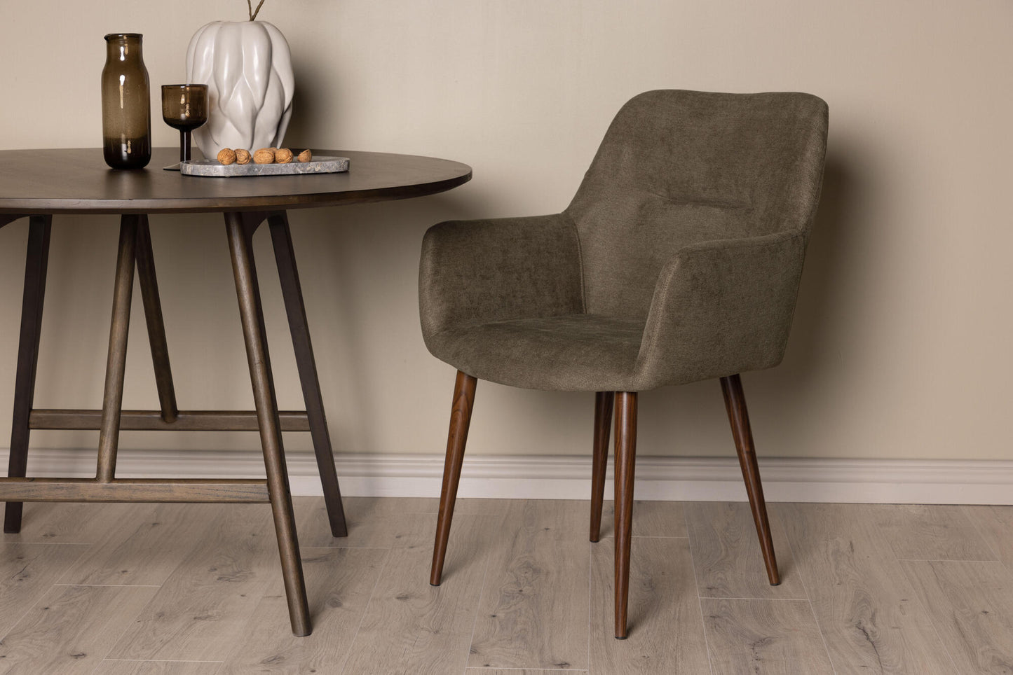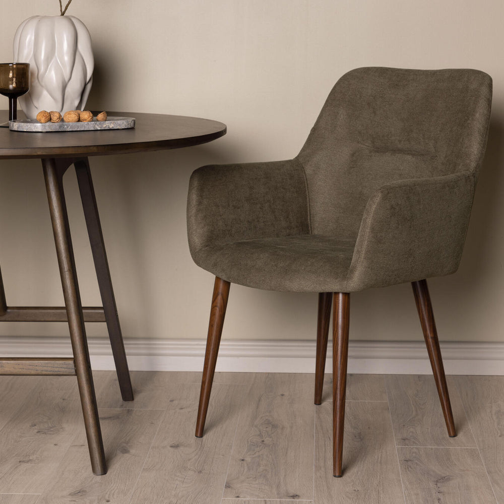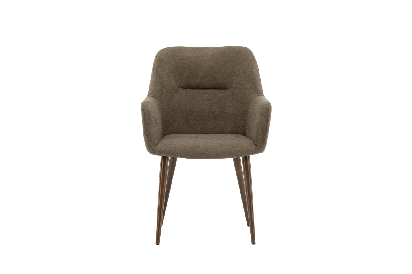 Tomorrow sarja söögitool pakub ideaalset istumismugavust, et saaksid nautida pikki ja meeldivaid hetki laua taga. Täispolsterdatud iste koos integreeritud käetugedega on kaetud pruuni polüesterkangaga, samas kui kergelt väljapoole ulatuvad toolijalad modernses pähklipruunis toonis lisavad elegantsi.