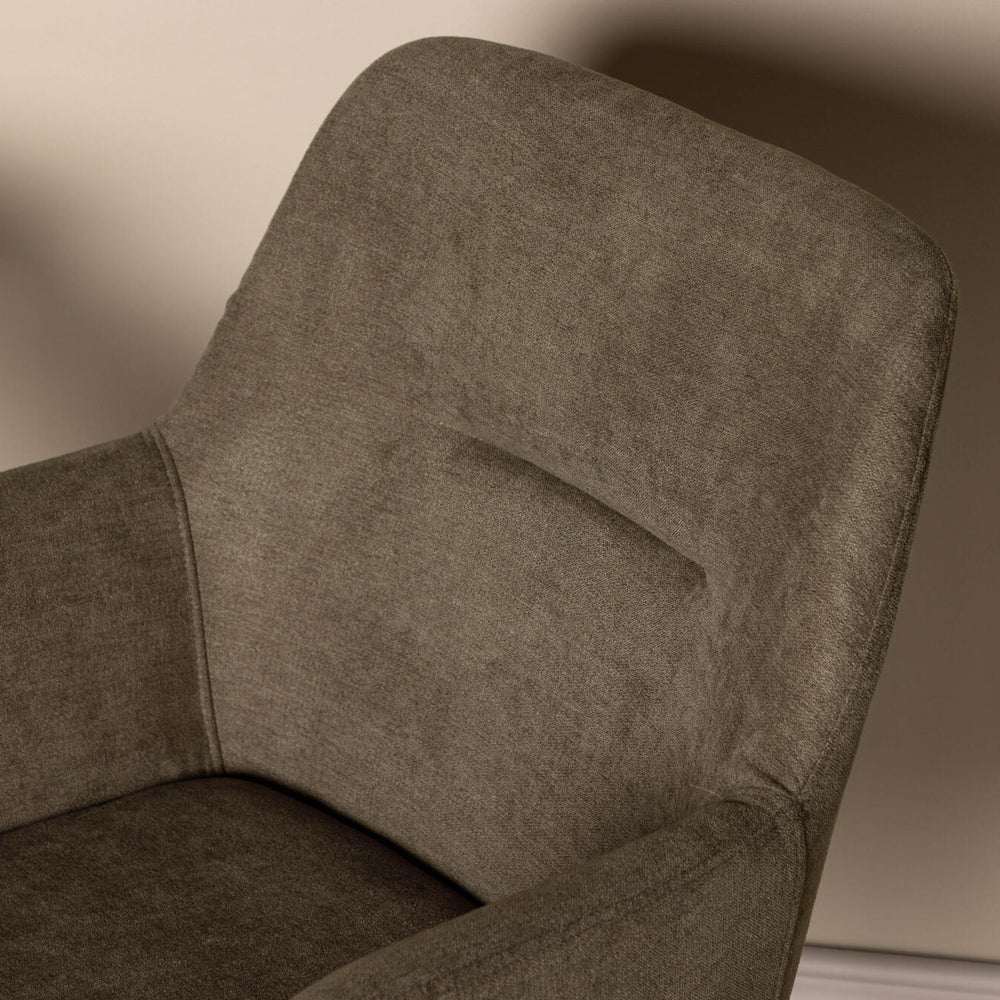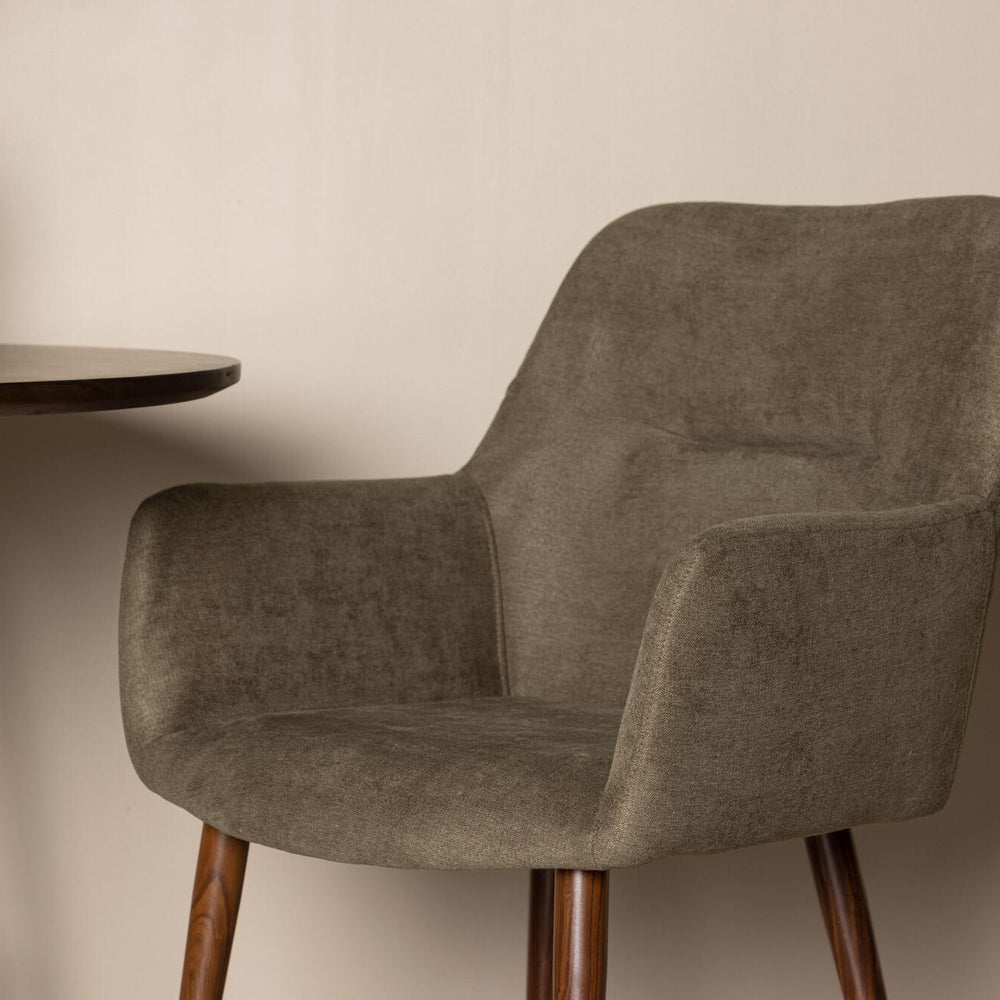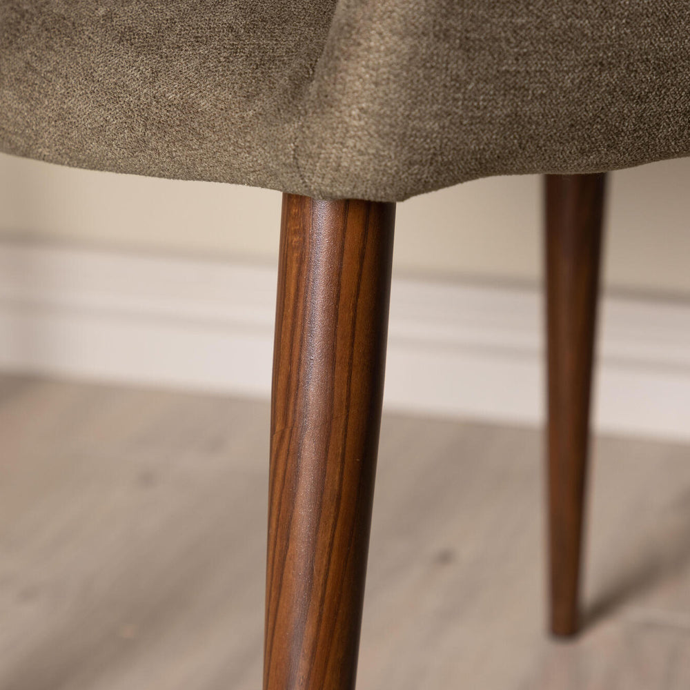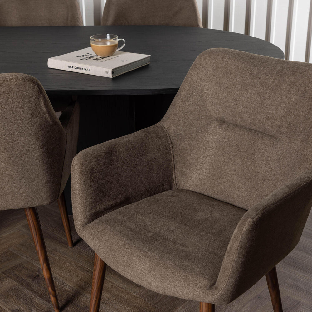Tomorrow sarja söögitool pakub ideaalset istumismugavust, et saaksid nautida pikki ja meeldivaid hetki laua taga. Täispolsterdatud iste koos integreeritud käetugedega on kaetud pruuni polüesterkangaga, samas kui kergelt väljapoole ulatuvad toolijalad modernses pähklipruunis toonis lisavad elegantsi.