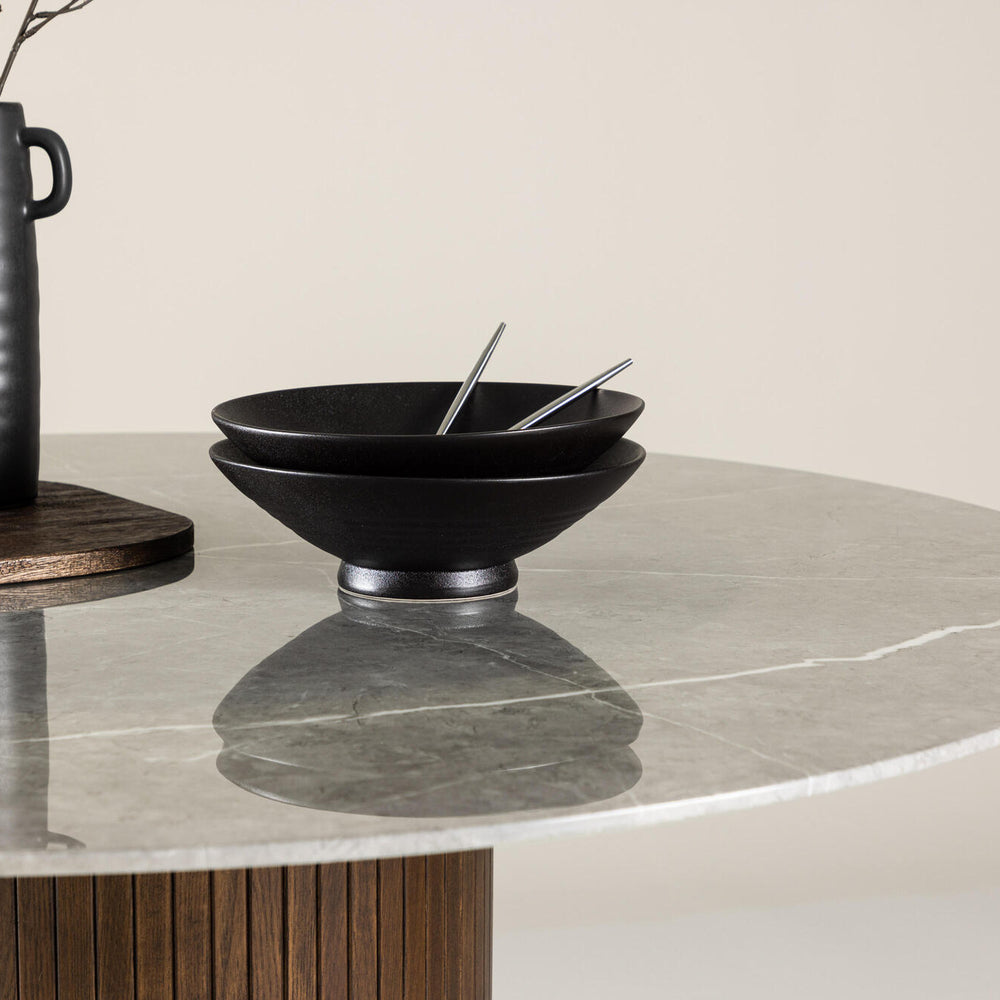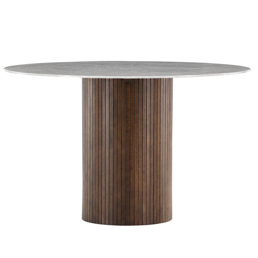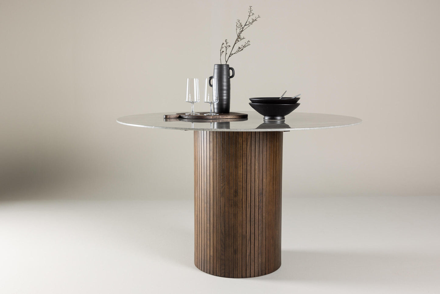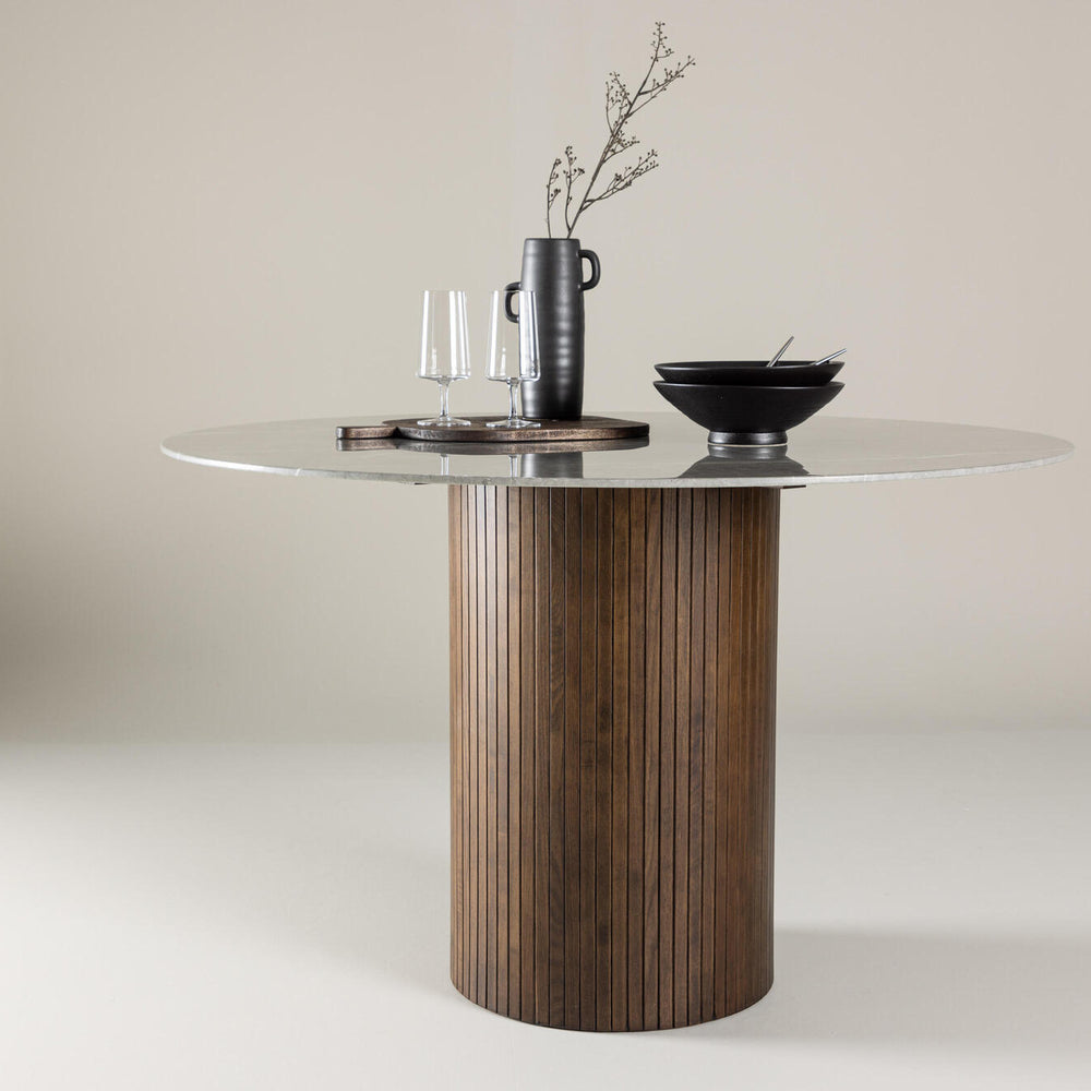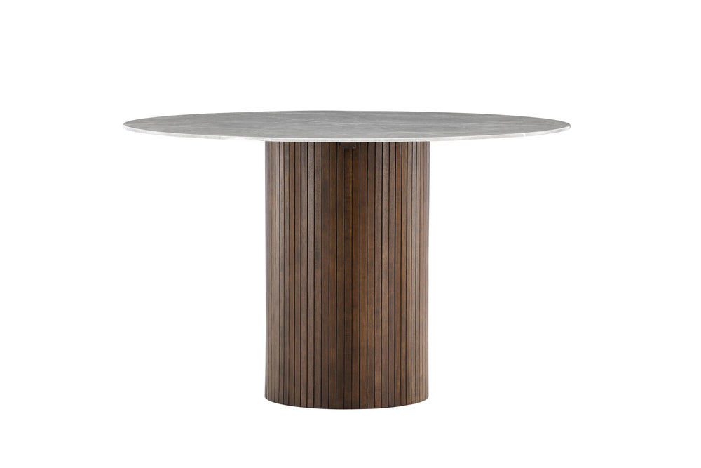 Härön on unikaalse disainiga ümmargune söögilaud, mis toob ruumi luksusliku ja ajatu ilme. Ümar kiviplaat lisab elegantsi, samas kui tumepruun silindrikujuline lauajalg annab lauale iseloomu ja stabiilsuse.