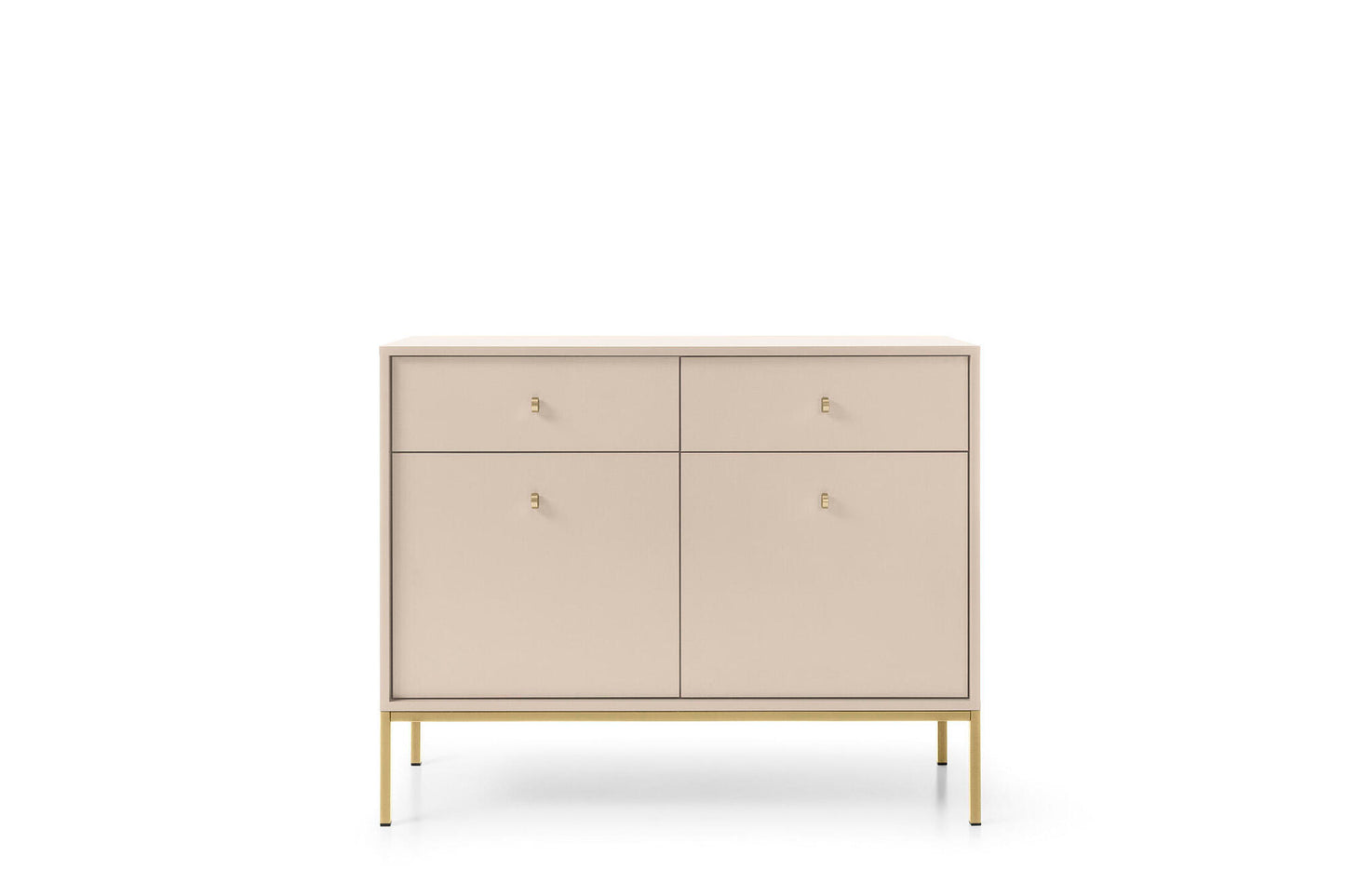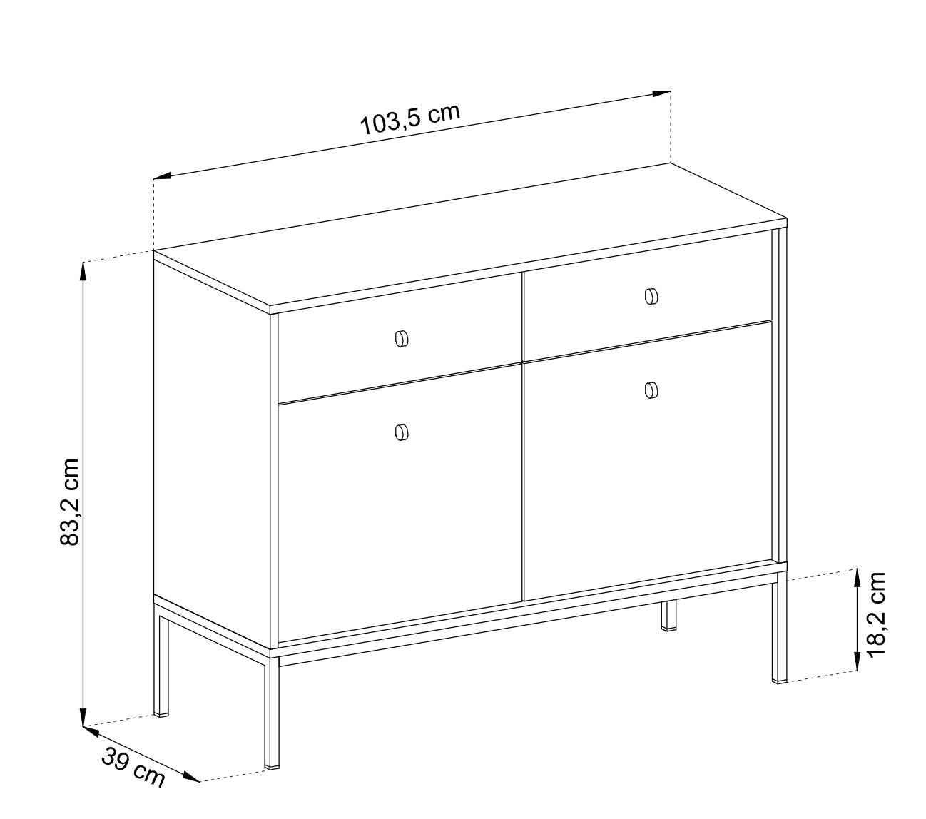 Valmistatud töödeldud puidust, melamiinist, MDF-ist ja terasest, tagab see kummut vastupidavuse ja kvaliteetse viimistluse. Kahe hingedega ukse ja kahe sahtliga disain pakub praktilist ja avarat hoiuruumi, aidates hoida kõik vajalikud esemed käepärast.